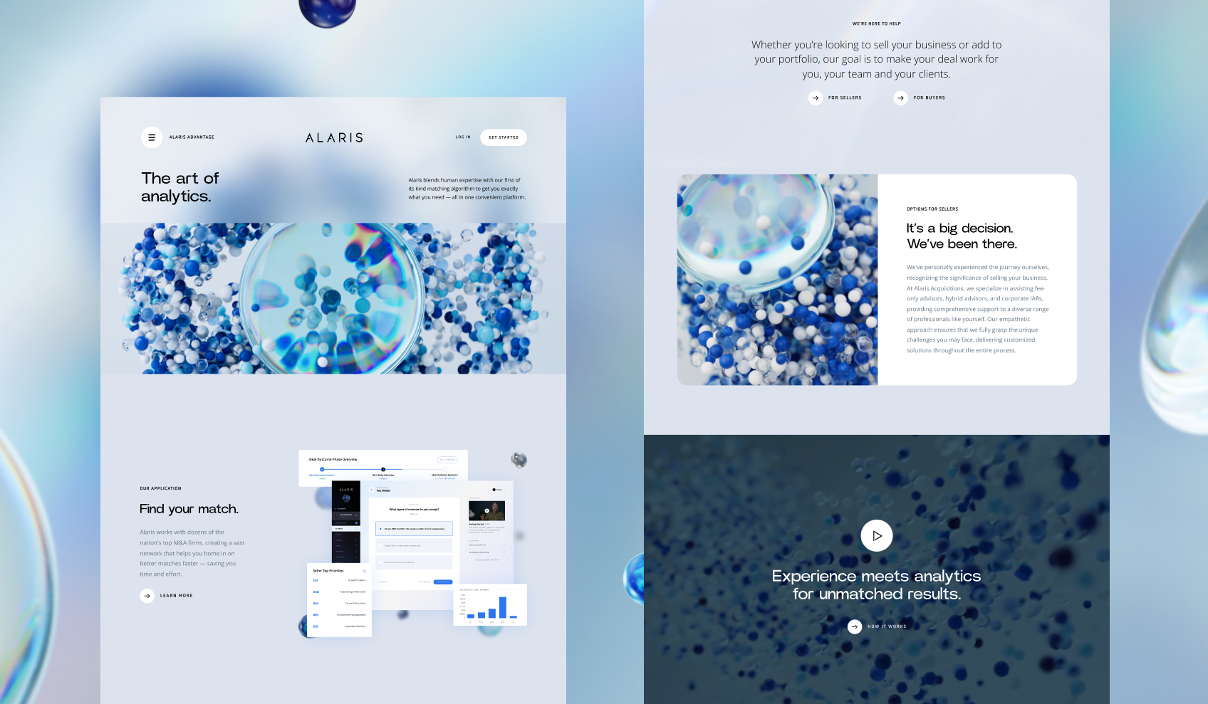 The mergers and acquisitions industry is inundated with digital sameness—a category full of brand websites with endless stock photo handshakes, with the same messaging around the same dated process. Alaris Acquisitions wanted to break the mold with a new algorithm-based approach to help clients find their ideal match. So, we built them an innovative website to match their ambition.